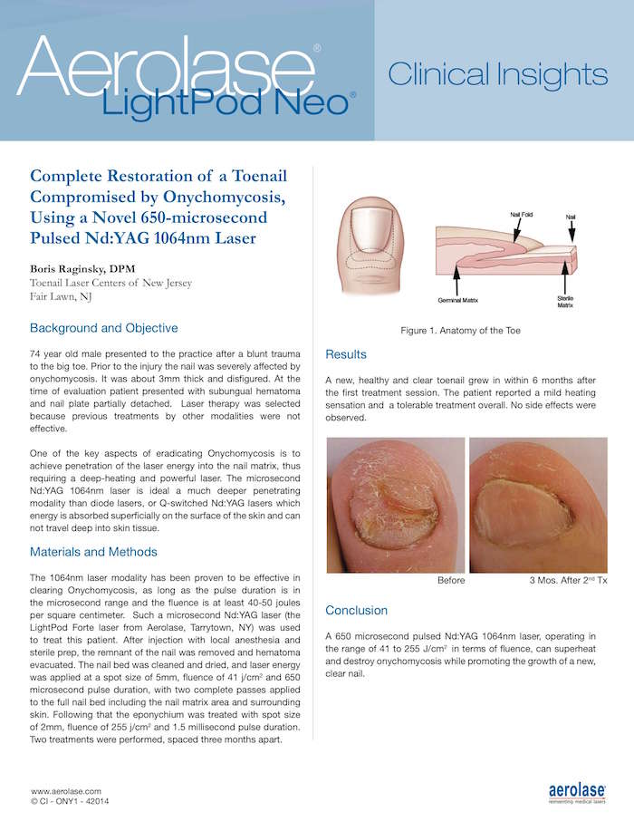 Dr. Juliette Hepburn, Dermatologie, Nassau, Bahamas Mit üblichen Methoden zur Wundheilung gelingt es oft nicht, eine Wunde vollständig zu schließen; eine neue Lasertherapie mit einem neuartigen Nd:YAG-Laser mit einer Pulsdauer von 650 μs und einer Wellenlänge von 1064 nm (Neo, Aerolase, Tarrytown, NY) hat jedoch bereits zu guten klinischen Erfolgen beim Wundverschluss ohne Kontakt mit der Wunde geführt. Es wurde klinisch nachgewiesen, dass 1064-nm-Laserenergie die Bildung von neuem Kollagen in der Dermis der Haut stimuliert. Es wird auch angenommen, dass die von einem 1064-nm-Laser erzeugte Wärme die bakterielle Zerstörung, die Stickoxidproduktion und die Wundheilungskaskade stimuliert. Ein Patient mit Geschwüren an den distalen Bereichen der Füße wurde mit dem betreffenden Laser behandelt. Er sprach schnell auf die Behandlung an. Der Patient berichtete von keinerlei Behandlungsbeschwerden. Beide Geschwüre waren in kurzer Zeit vollständig reepithelisiert (siehe zusätzliche Daten unten). Die Patientenzufriedenheit war sehr hoch. Das zweimal behandelte Geschwür wurde nach 10 Monaten einer Nachuntersuchung unterzogen; es war immer noch vollständig verschlossen, wobei kaum sichtbare Anzeichen dafür vorhanden waren, wo sich das Geschwür befunden hatte.