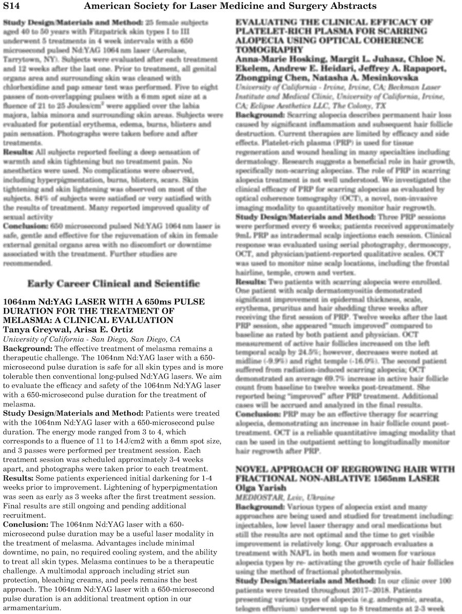 Tanya Greywal, MD, Arisa Ortiz, MD Ortiz, A., Greywal, T. „1064nm Nd:YAG LASER WITH A 650ms PULSE DURATION FOR THE TREATMENT OF MELASMA: A CLINICAL EVALUATION“ Lasers Surg Med. 2019 Mar;51(S31):S13-14.