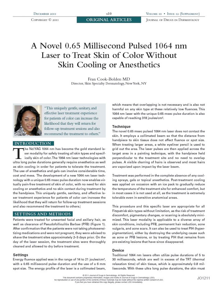 Fran Cook-Bolden, MD, Dermatologie, New York, NY Journal of Drugs in Dermatology, Dezember 2011 Der Nd:YAG-1064-nm-Laser hat sich zum Goldstandard für die sichere Behandlung aller Hauttypen und speziell dunkler Haut entwickelt. Die 1064-nm-Lasertechnologien mit ultralanger Pulsdauer erfordern im Allgemeinen Anästhetika sowie eine Hautkühlung, damit die Patienten die Behandlung vertragen. Die Verwendung von Anästhetika und Gelen kann einen erheblichen Zeit- und Kostenaufwand sowie Schwierigkeiten verursachen. Die Entwicklung einer neuen 1064-nm-Lasertechnologie mit einer einzigartigen Pulsdauer von 0,65 ms ermöglicht jetzt eine nahezu schmerzfreie Behandlung von dunkler Haut; Hautkühlung, Anästhetika und Hautkontakt mit dem Handstück während der Behandlung sind nicht erforderlich. Diese einzigartig sanfte, hygienische und wirksame Laserbehandlung für Patienten mit dunkler Haut kann die Wahrscheinlichkeit erhöhen, dass sie zu Folgebehandlungen zurückkehren und die Behandlung weiterempfehlen.