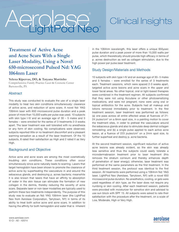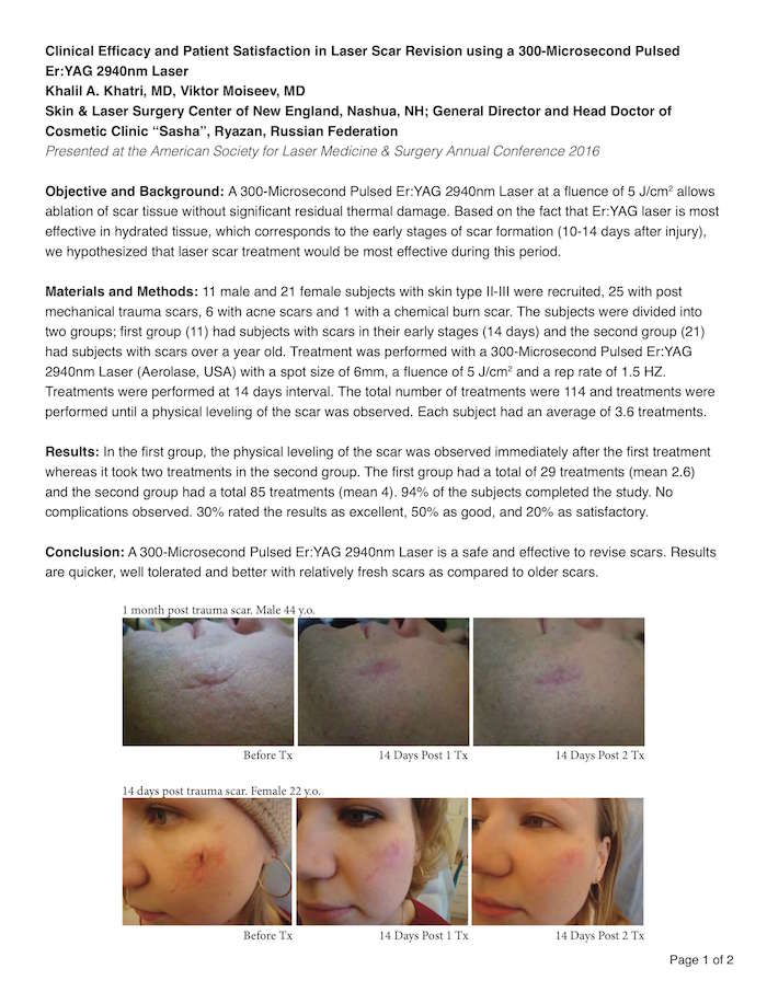 Khalil A. Khatri, MD, Skin & Laser Surgery Center of New England, Nashua, NH; Viktor Moiseev, MD, Generaldirektor und Chefarzt der Kosmetikklinik „Sasha“, Ryazan, Russische Föderation Zielsetzung und Hintergrund: Ein Er:YAG-Laser mit einer Pulsdauer von 300 μs, einer Wellenlänge von 2940 nm und einer Fluenz von 5 J/cm2 ermöglicht die Ablation von Narbengewebe ohne signifikante thermische Restschäden. Basierend auf der Tatsache, dass der Er:YAG-Laser in hydratisiertem Gewebe am wirksamsten ist, was den frühen Stadien der Narbenbildung (10 bis 14 Tage nach einer Verletzung) entspricht, stellten wir die Hypothese auf, dass die Laser-Narbenbehandlung während dieser Zeit am effektivsten wäre. Materialien und Methoden: 11 männliche und 21 weibliche Studienteilnehmer mit Hauttyp II bis III wurden rekrutiert, 25 mit postmechanischen Traumanarben, 6 mit Aknenarben und 1 mit einer Verätzungsnarbe. Die Studienteilnehmer wurden in zwei Gruppen eingeteilt. Die erste Gruppe (11) bestand aus Patienten mit Narben im Frühstadium (14 Tage), und die zweite Gruppe (21) bestand aus Patienten mit Narben, die älter waren als ein Jahr. Die Behandlung wurde mit einem Er:YAG-Laser (Aerolase, USA) mit einer Pulsdauer von 300 μs, einer Wellenlänge von 2940 nm, einer Spotgröße von 6 mm, einer Fluenz von 5 J/cm2 und einer Wiederholungsrate von 1,5 Hz durchgeführt. Die Behandlungen wurden im Abstand von 14 Tagen durchgeführt. Die Gesamtzahl der Behandlungen betrug 114. Die Behandlungen wurden durchgeführt, bis eine Abflachung der Narben beobachtet wurde. Jeder Studienteilnehmer wurde durchschnittlich 3,6 Behandlungen unterzogen. Ergebnisse: In der ersten Gruppe wurde die Abflachung der Narbe unmittelbar nach der ersten Behandlung beobachtet, während in der zweiten Gruppe zwei Behandlungen erforderlich waren. Die erste Gruppe erhielt insgesamt 29 Behandlungen (Mittelwert 2,6) und die zweite Gruppe erhielt insgesamt 85 Behandlungen (Mittelwert 4). 94 % der Studienteilnehmer schlossen die Studie ab. Es wurden keine Komplikationen beobachtet. 30 % der Studienteilnehmer beurteilten die Ergebnisse als ausgezeichnet, 50 % als gut und 20 % als zufriedenstellend. Schlussfolgerung: Ein Er:YAG-Laser mit einer Pulsdauer von 300 μs und einer Wellenlänge von 2940 nm ist ein sicheres und effektives Instrument zur Narbenkorrektur. Der Laser ist gut verträglich, und bei relativ frischen Narben sind schnellere und bessere Ergebnisse zu beobachten als bei älteren Narben. Wie auf der Jahrestagung 2016 der American Society for Laser Medicine & Surgery ASLMS veröffentlicht