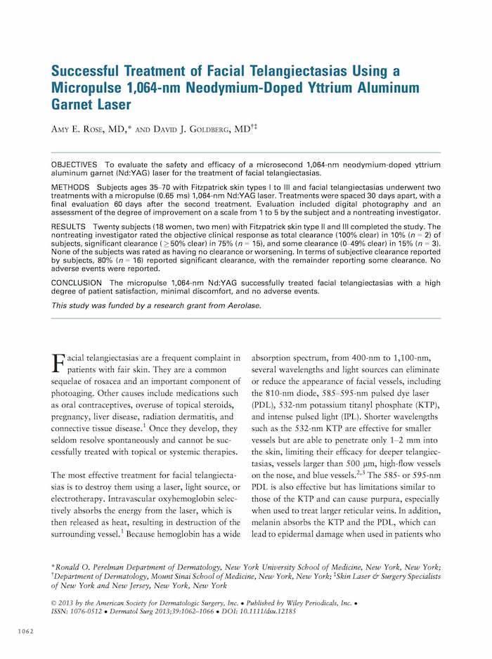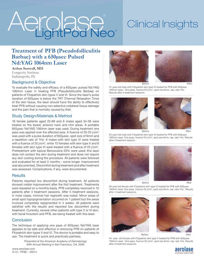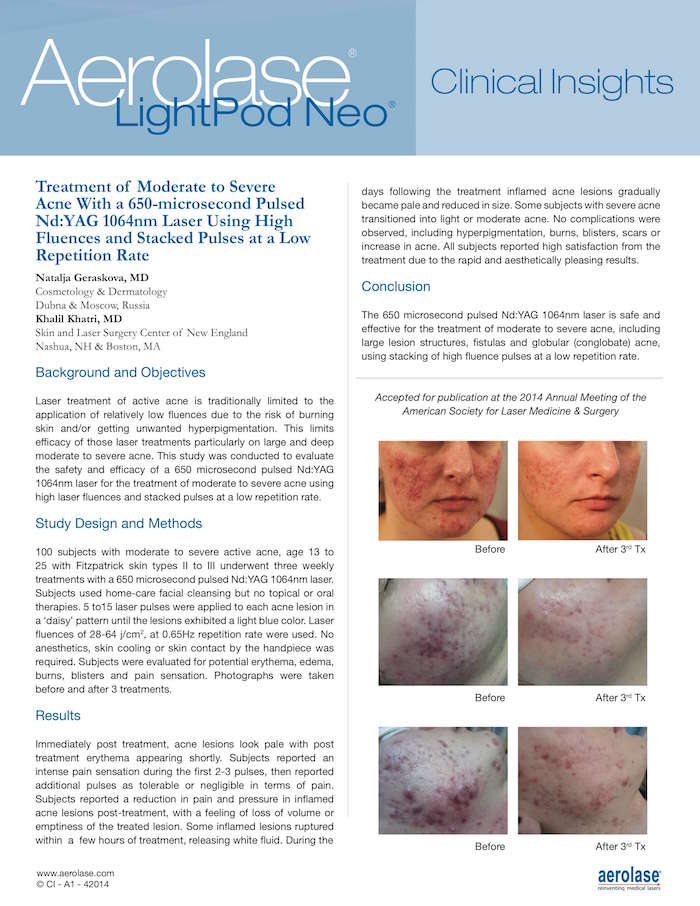 Aufbauend auf diesen traditionellen Behandlungsoptionen entwickelte Aerolase mit der klinischen Expertise der in Washington DC ansässigen Dermatologin Cheryl Burgess, MD, ein zweistufiges „One-Two-Punch“-Protokoll, um Melasma bei allen Hauttypen in einer einzigen Behandlungssitzung wirksam zu behandeln. Die Aerolase-Technologie des Nd:YAG-Lasers mit einer Pulsdauer von 650 μs und einer Wellenlänge von 1064 nm bietet eine Lösung, um das tiefere dermale Melanin und die vaskulären Komponenten(6) von Melasma zu behandeln und gleichzeitig das epidermale Pigment aufzubrechen. Die Laserenergie wird mit einer Fluenz von bis zu 28 J/cm2 über den gesamten Gesichtsbereich aufgebracht. Dann wird je nach Hauttyp und Hautzustand des Patienten entweder ein leichtes bis mittleres chemisches Peeling oder ein Hydrochinonpräparat aufgetragen, um die verbleibende epidermale Pigmentierung zu behandeln.