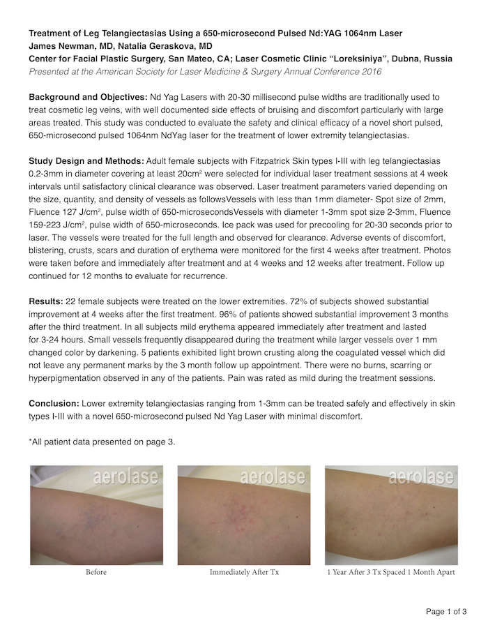 Teleangiektasien der unteren Extremitäten von 1 bis 3 mm können bei den Hauttypen I bis III mit einem neuartigen Nd:Yag-Laser mit einer Pulsdauer von 650 μs unter minimalen Beschwerden sicher und wirksam behandelt werden. Wie auf der Jahrestagung 2016 der American Society for Laser Medicine & Surgery ASLMS veröffentlicht
