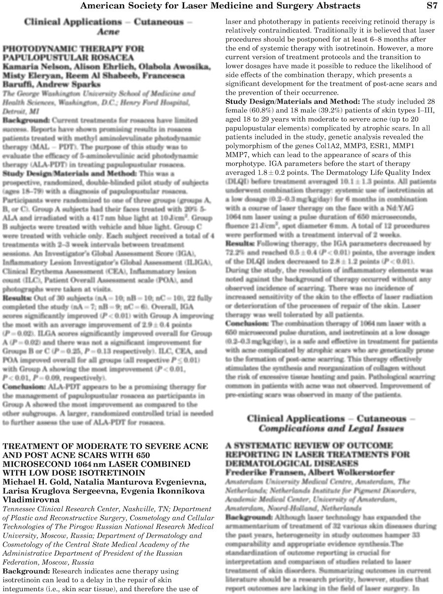 Michael H. Gold, Natalia Manturova Evgenievna, Larisa Kruglova Sergeevna, Evgenia Ikonnikova Vladimirovna Gold M., Evgenievna N., Sergeevna L., Vladimirovna E., „TREATMENT OF MODERATE TO SEVERE ACNE AND POST ACNE SCARS WITH 650 MICROSECOND 1064 nm LASER COMBINED WITH LOW DOSE ISOTRETINOIN (BEHANDLUNG VON MITTELSCHWERER BIS SCHWERER AKNE UND AKNENARBEN MIT EINEM LASER MIT EINER PULSDAUER VON 650 μs UND EINER WELLENLÄNGE VON 1064 nm IN KOMBINATION MIT EINER NIEDRIGEN DOSIS ISOTRETINOIN),“ Lasers Surg Med. 2019 Mär;51(S31):S13-14